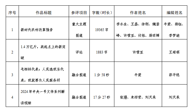 根據(jù)中國(guó)期刊協(xié)會(huì)《關(guān)于開(kāi)展第35屆中國(guó)新聞獎(jiǎng)新聞期刊作品初評(píng)工作的通知》要求,中國(guó)農(nóng)村雜志社擬推薦4件作品參評(píng),現(xiàn)予以公示。公示期為3月26日至4月1日,共5個(gè)工作日。如有異議,請(qǐng)及時(shí)反映。