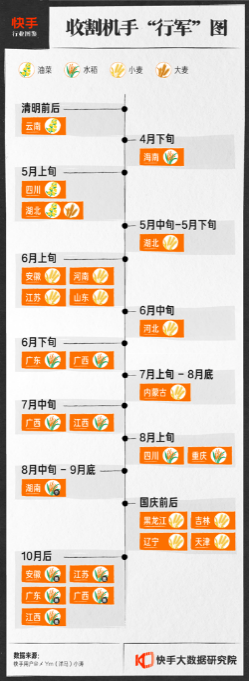 在快手上,創作者小濤(快手ID:305693397)通過多條短視頻細致地分享了不同地區主要農作物的成熟時間與路線安排: