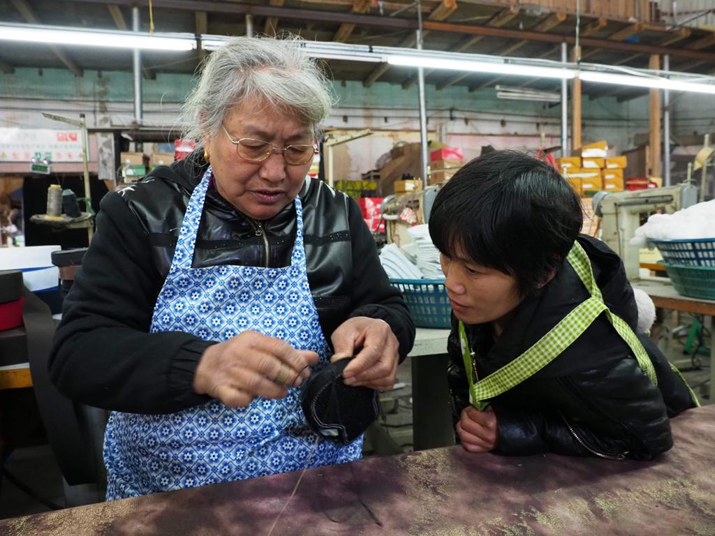 3月15日,在浙江省景寧縣鶴溪街道,72歲的制鞋能手施岳群(左)教新來的女工徐海菊縫制鞋幫。