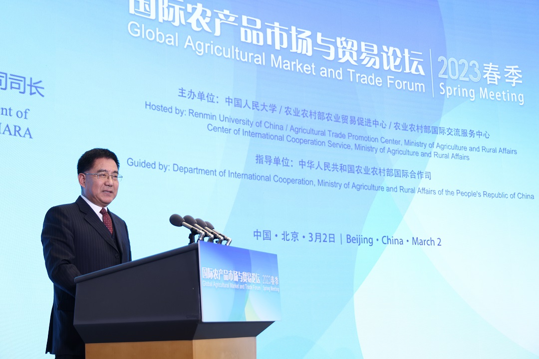 3月2日下午,2023年國際農產品市場與貿易(春季)論壇在北京成功舉辦。農業農村部國際合作司司長隋鵬飛、中國人民大學副校長王軼、商務部外貿司二級巡視員承春出席論壇并致辭。論壇設置主題演講和專題討論兩個環節,分別由農業農村部農業貿易促進中心主任馬洪濤和中國人民大學農業與農村發展學院院長仇煥廣主持。