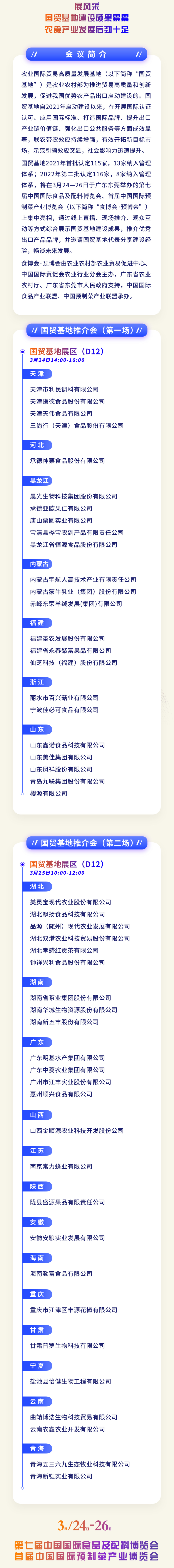 國貿(mào)基地2021年首批認(rèn)定115家,13家納入管理體系;2022年第二批認(rèn)定116家,8家納入管理體系,將在3月24—26日于廣東東莞舉辦的第七屆中國國際食品及配料博覽會、首屆中國國際預(yù)制菜產(chǎn)業(yè)博覽會(以下簡稱“食博會·預(yù)博會”)上集中亮相,通過線上直播、現(xiàn)場推介、觀眾互動等方式綜合展示國貿(mào)基地建設(shè)成果,推介優(yōu)秀出口產(chǎn)品品牌,并邀請國貿(mào)基地代表分享建設(shè)經(jīng)驗,暢談未來發(fā)展。