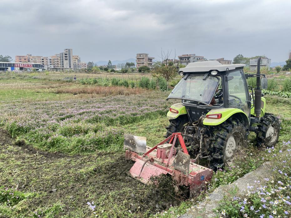 春意初顯的羅定盆地,萬畝紫云英花海隨風(fēng)搖曳。農(nóng)用機(jī)械的轟鳴聲中,紫云英被粉碎翻壓還田,化為滋養(yǎng)土地的“綠色黃金”。