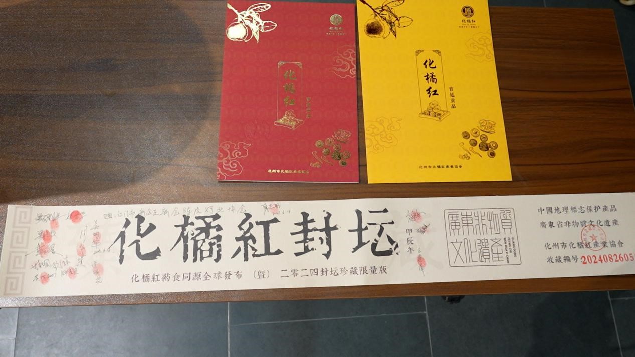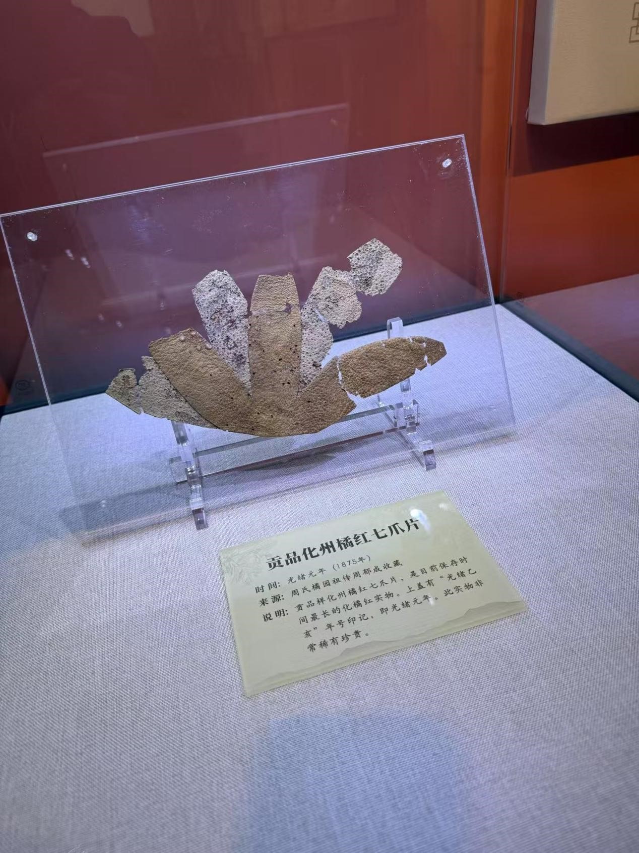 在化州市培林橘紅種植專業合作社的展廳內,氣氛熱烈而莊重。全國人大代表、全國勞動模范、化州市化橘紅產業協會會長廖志略,滿懷自豪地向考察團展示著一捆棕褐色的陳年七爪化橘紅,其色澤深沉,紋理間仿佛訴說著歲月的故事。廖志略介紹道:“這是采用了16道非遺工藝精心炮制而成的精品七爪化橘紅,是化橘紅非遺工藝的杰出代表,素有‘陳久者良’的美譽 。”