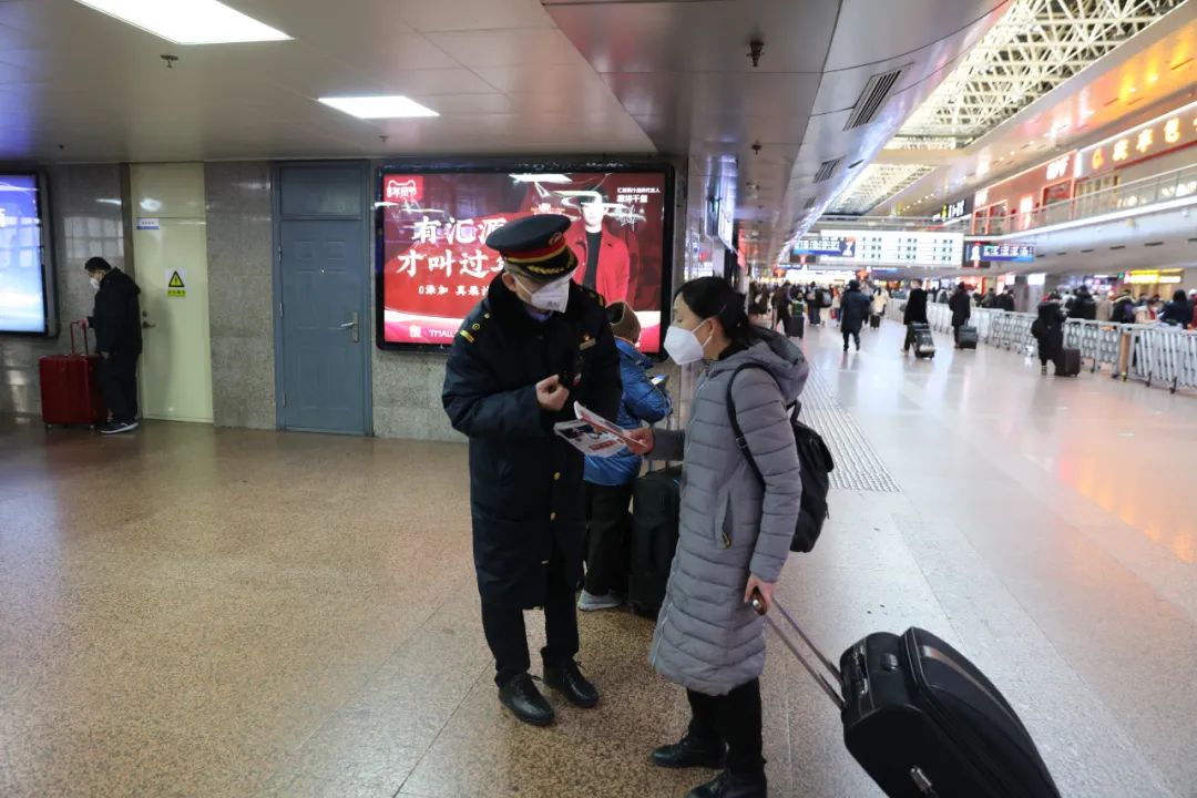 在贈送??耐瑫r,工作人員還為旅客們提供了力所能及的問詢、答疑等服務。一位河北衡水的返鄉旅客在匆匆趕路的過程中不慎將拉桿箱損壞,注意到情況的工作人員立刻找來了寬膠帶幫他固定,他感動地說:“這次活動不僅送來了知識,更送來了愛心,讓我感覺到了春天的溫暖,咱們今年一定會更好!”