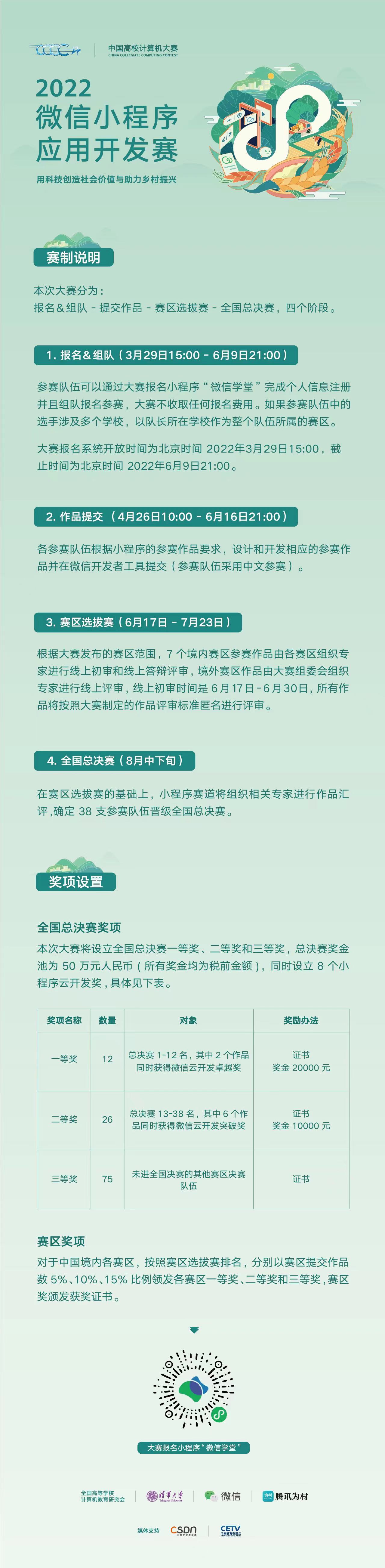 3月29日,2022年中國高校計算機大賽“微信小程序應用開發賽”(以下簡稱“大賽”)正式啟動。大賽由清華大學與騰訊公司微信事業群聯合主辦,騰訊可持續社會價值事業部為村發展實驗室協辦,鄉村建設高校聯盟支持,聚焦“用科技創造社會價值與助力鄉村振興”主題。大賽旨在通過競賽的方式,提升學生設計與開發微信小程序應用的能力,實現以賽促學、以賽促教、以賽促用,推動微信生態體系的人才培養和產學研用。