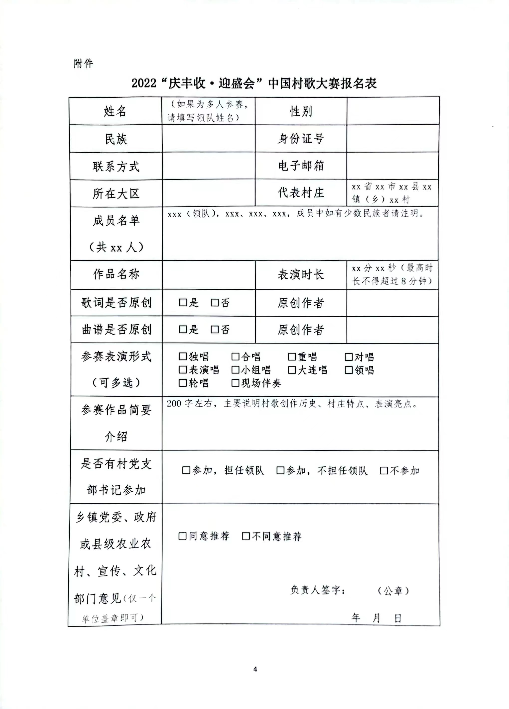 附件:2022“慶豐收·迎盛會”中國村歌大賽報名表(可點擊下載)