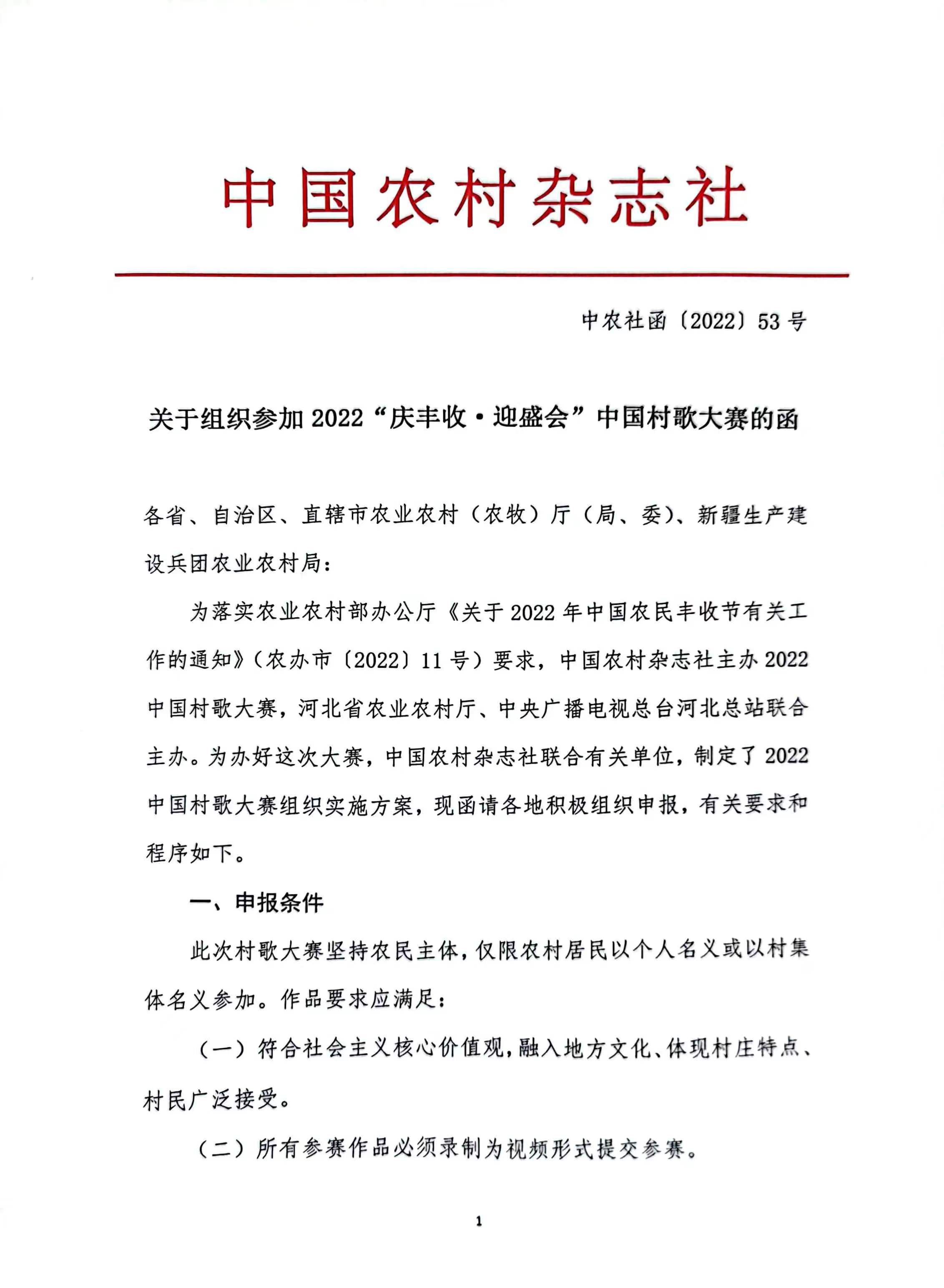 為落實農(nóng)業(yè)農(nóng)村部辦公廳《關(guān)于2022年中國農(nóng)民豐收節(jié)有關(guān)工作的通知》(農(nóng)辦市〔2022〕11號)要求,中國農(nóng)村雜志社主辦2022中國村歌大賽,河北省農(nóng)業(yè)農(nóng)村廳、中央廣播電視總臺河北總站聯(lián)合主辦。為辦好這次大賽,中國農(nóng)村雜志社聯(lián)合有關(guān)單位,制定了2022中國村歌大賽組織實施方案,現(xiàn)函請各地積極組織申報,有關(guān)要求和程序如下。