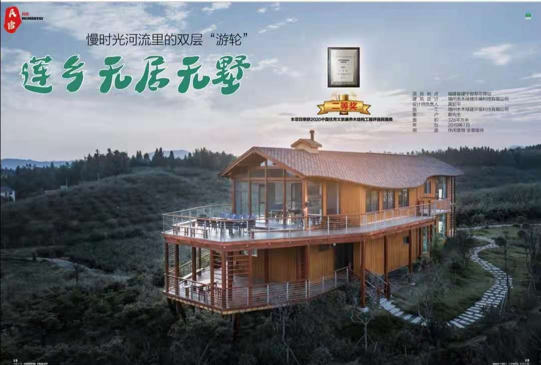 他們在莊園一處山頭上建起了一棟現代歐式高檔木屋。建筑四周設計了外廊、挑臺、露臺,360度的環繞視野,像一艘行駛在時間河流里的雙層游輪緩緩而行,命名為“蓮鄉無居無墅”。這棟歐式木屋小樓榮獲2020年中國優秀文旅康養木結構工程評選民宿類二等獎。