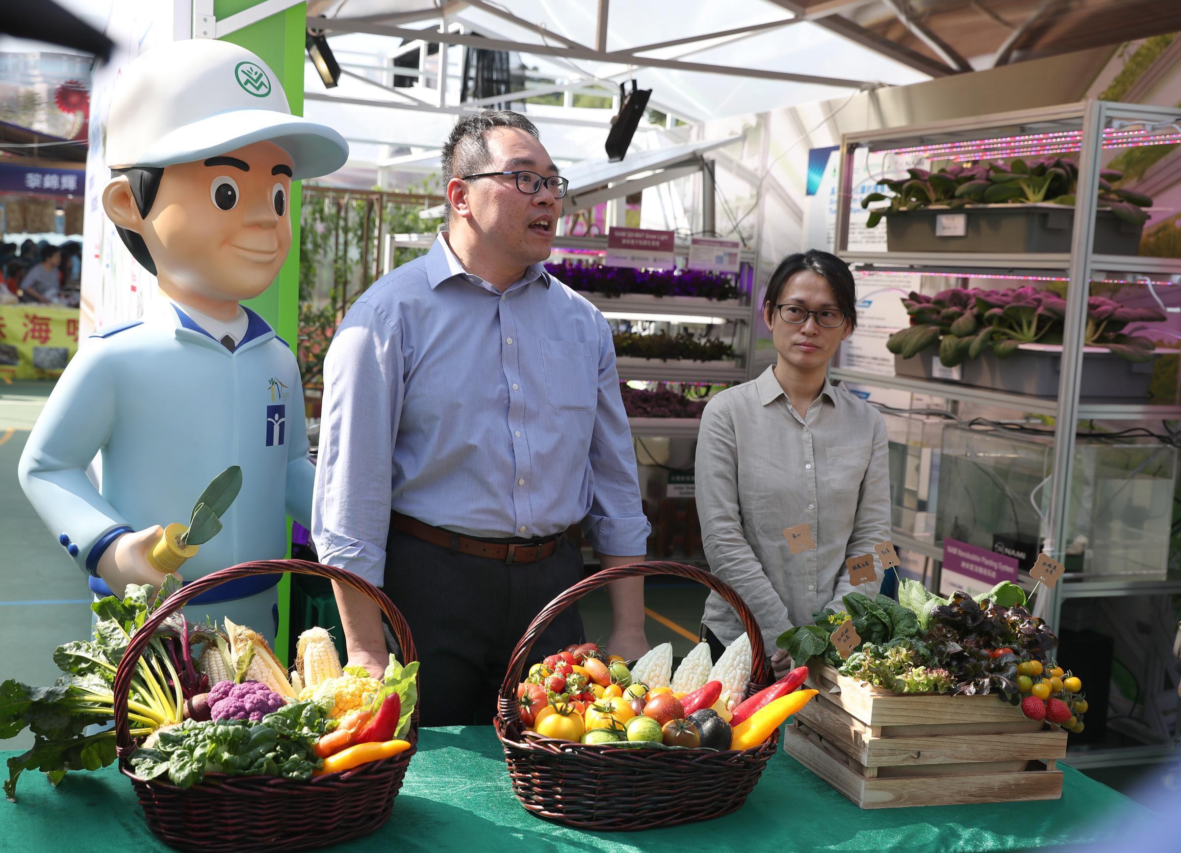 1月3日,香港“本地漁農美食嘉年華”的“蔬菜工廠”展位技術員在介紹新的種菜技術和成果。