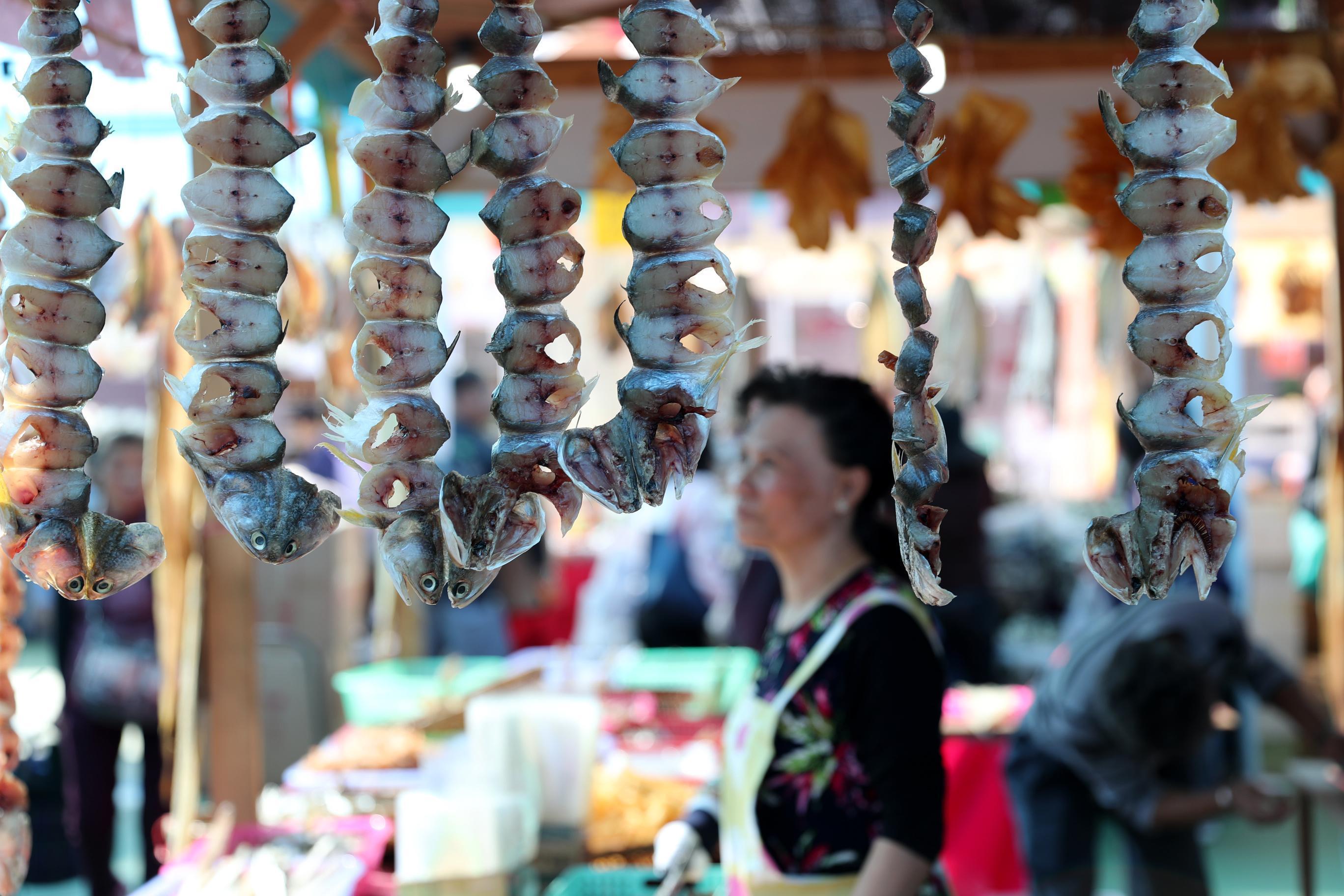 1月3日,香港“本地漁農美食嘉年華”的魚攤售貨員在招呼顧客。