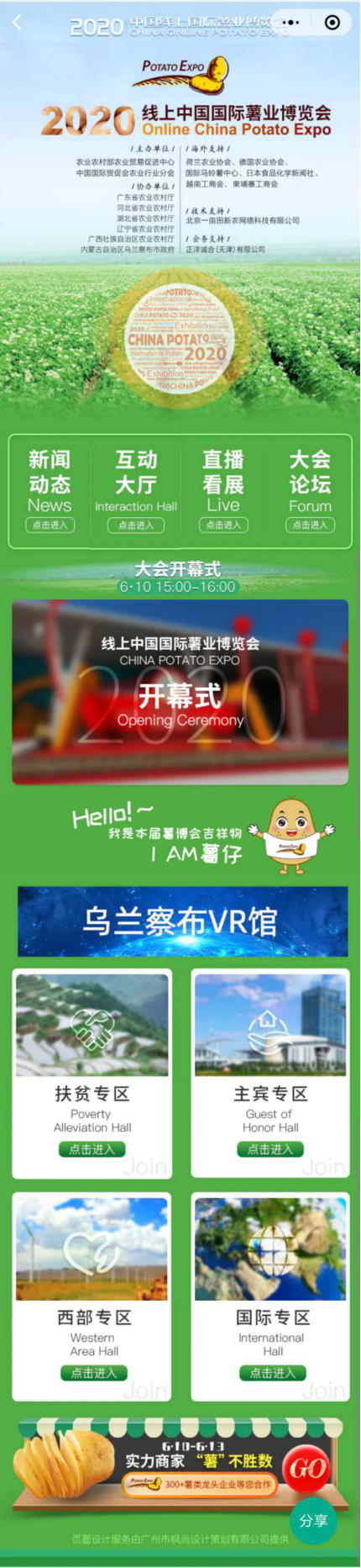 中國國際薯業(yè)博覽會是規(guī)模亞洲第一、世界第二的國際性薯業(yè)展覽會,迄今已成功連續(xù)舉辦十屆。今年為應(yīng)對疫情沖擊、創(chuàng)新展會服務(wù)模式,同時開展國際經(jīng)貿(mào)合作、擴大農(nóng)產(chǎn)品銷售,薯博會首次從線下走到線上。主辦方介紹,2020線上薯博會還開展了“馬鈴薯親善大使”、“主賓國”、“我為馬鈴薯代言”等創(chuàng)新嘗試。