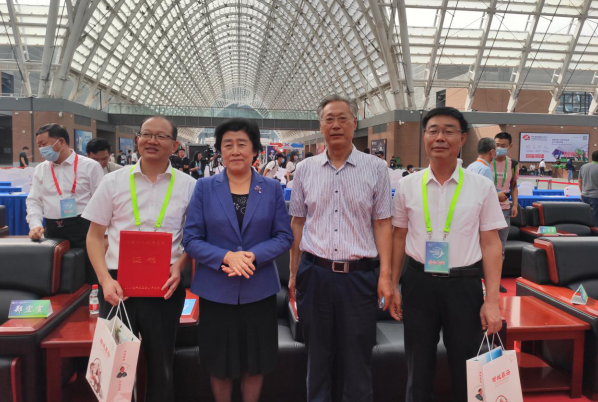 (圖:鄒城市副市長張傳馳(左二)、農業農村局副局長董富林(右三)在展位上同企業代表合影)