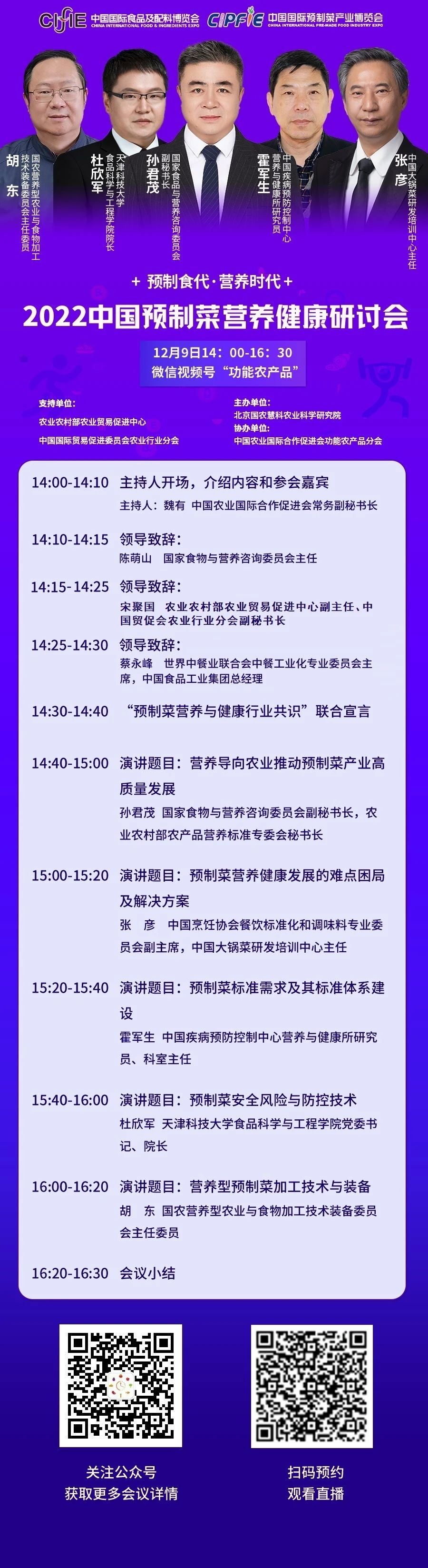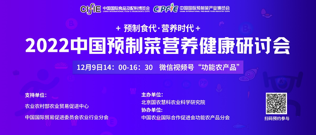 原定11月在廣東東莞舉辦的“第七屆中國國際食品及配料博覽會暨首屆中國國際預制菜產業博覽會”已延期舉辦,博覽會配套活動之一——“2022中國預制菜營養健康研討會”,現調整為12月9日通過“線上直播”方式舉辦,在大雪節氣里,誠邀全國預制菜相關政府單位、科研機構、行業組織、企業參與!
