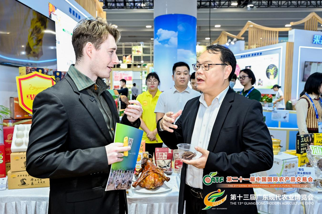 開平市馬岡鎮(zhèn)委書記張?jiān)姶嬖诨顒?dòng)現(xiàn)場(chǎng)為外國(guó)友人推介馬岡鵝
