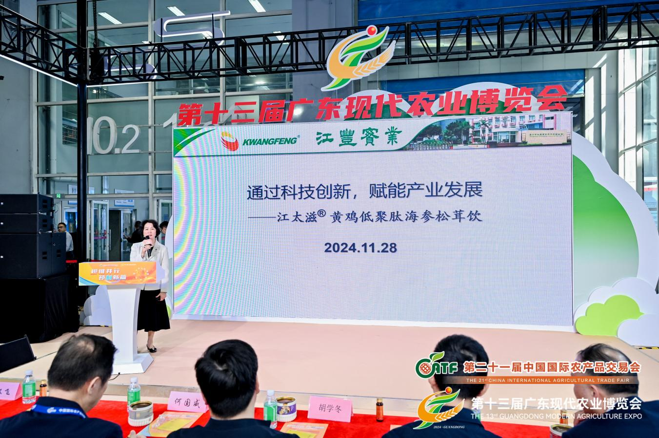 在推介新菜品及現(xiàn)場(chǎng)互動(dòng)品鑒環(huán)節(jié),國(guó)家級(jí)重點(diǎn)農(nóng)業(yè)龍頭企業(yè)廣州市江豐實(shí)業(yè)股份有限公司副總裁馮潔芳以及預(yù)制菜產(chǎn)業(yè)新銳一蔚廣府精品藥膳湯創(chuàng)始人何思敏紛紛登臺(tái),介紹各自團(tuán)隊(duì)精心研發(fā)的預(yù)制菜新品,并邀請(qǐng)現(xiàn)場(chǎng)嘉賓進(jìn)行品鑒。