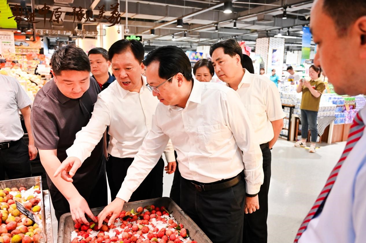 豫粵兩地農(nóng)業(yè)農(nóng)村部門調(diào)研廣東荔枝在鄭州商超的銷售情況。