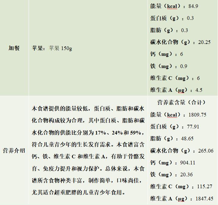 以10歲中等強度身體活動水平的肥胖兒童為例,并結合天津地區食物資源(春季)編寫了本食譜。其他年齡段兒童青少年可根據各年齡段食量、身高、體重和身體活動情況進行調整。使用者可參照兒童青少年肥胖食養原則和建議,近似替代部分食材,合理搭配食物。