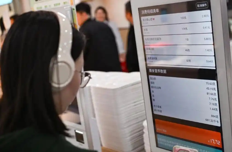 中國(guó)農(nóng)業(yè)大學(xué)東校區(qū),一名學(xué)生查看“智慧食堂”設(shè)備上的餐食營(yíng)養(yǎng)數(shù)據(jù)信息。