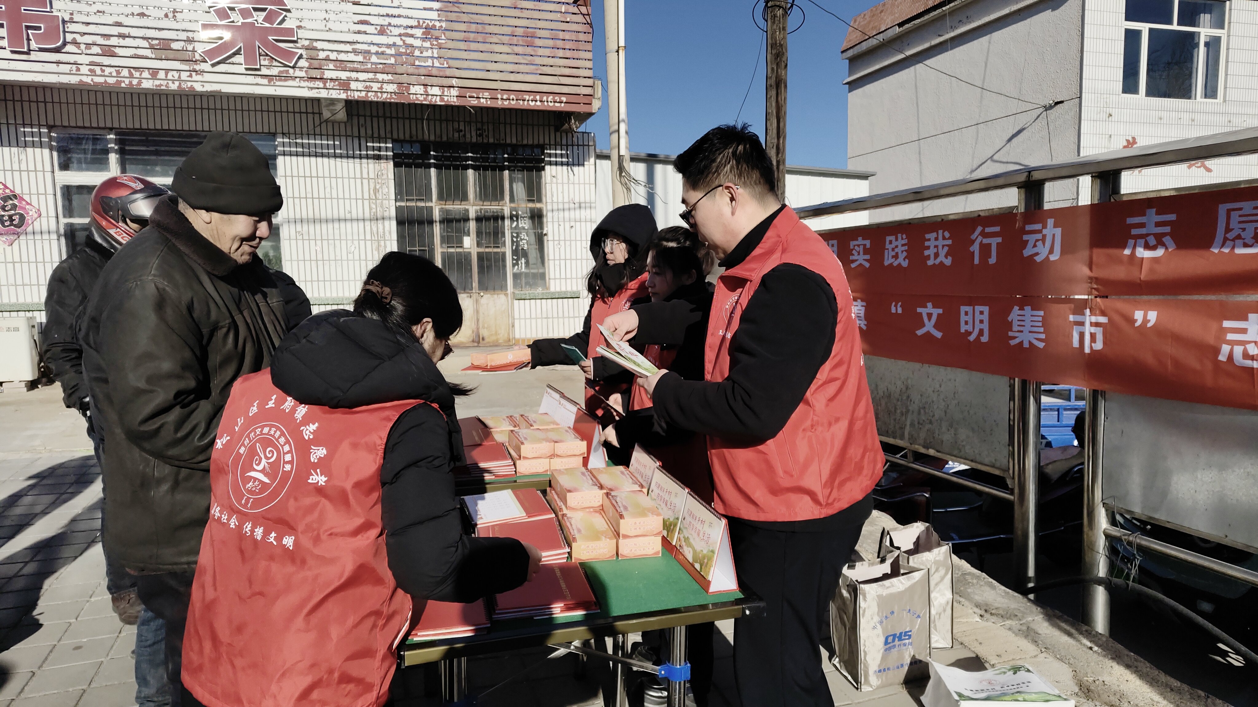 為持續推動文明實踐活動常態化、長效化、便民化,打通文明實踐服務群眾“最后一米”,1月7日,赤峰市松山區王府鎮新時代文明實踐所在敖包村集市常態化開展“文明集市”便民公益活動,現場熱鬧非凡,志愿者們為在集市購物的村民,免費發放新年臺歷和惠民政策宣傳品,同時面對面向村民講解森林防火知識,倡導村民春節期間文明祭祀,進一步深化移風易俗。廣大志愿者通過集市,為群眾提供一體化、多樣式的文明實踐組合“套餐”,把文明送到百姓身邊,讓廣大群眾在富有“煙火氣”的集市里感受“文明范兒”。