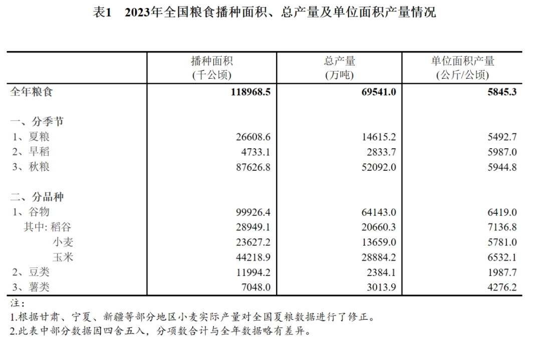 12月11日,國家統計局發布關于2023年糧食產量數據的公告,根據對全國31個省(區、市)的調查,2023年全國糧食播種面積、單位面積產量和總產量分別如下: