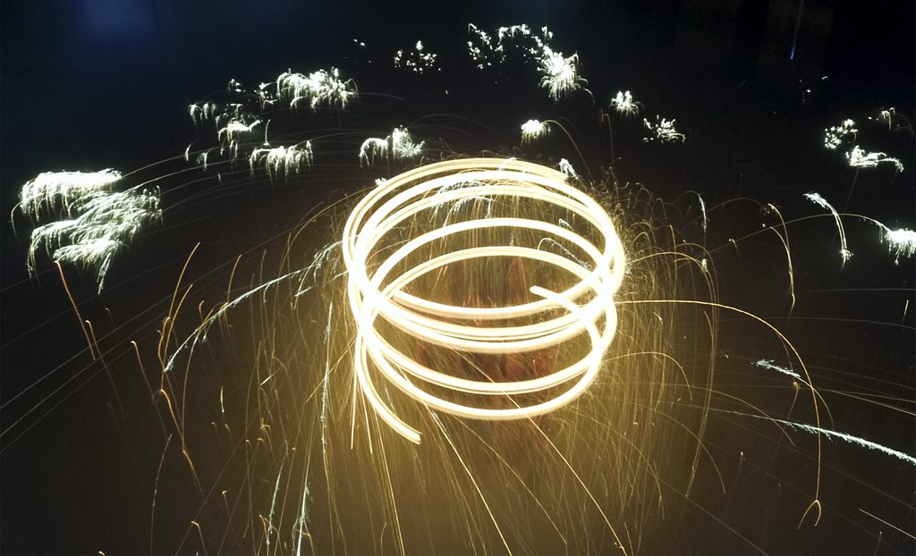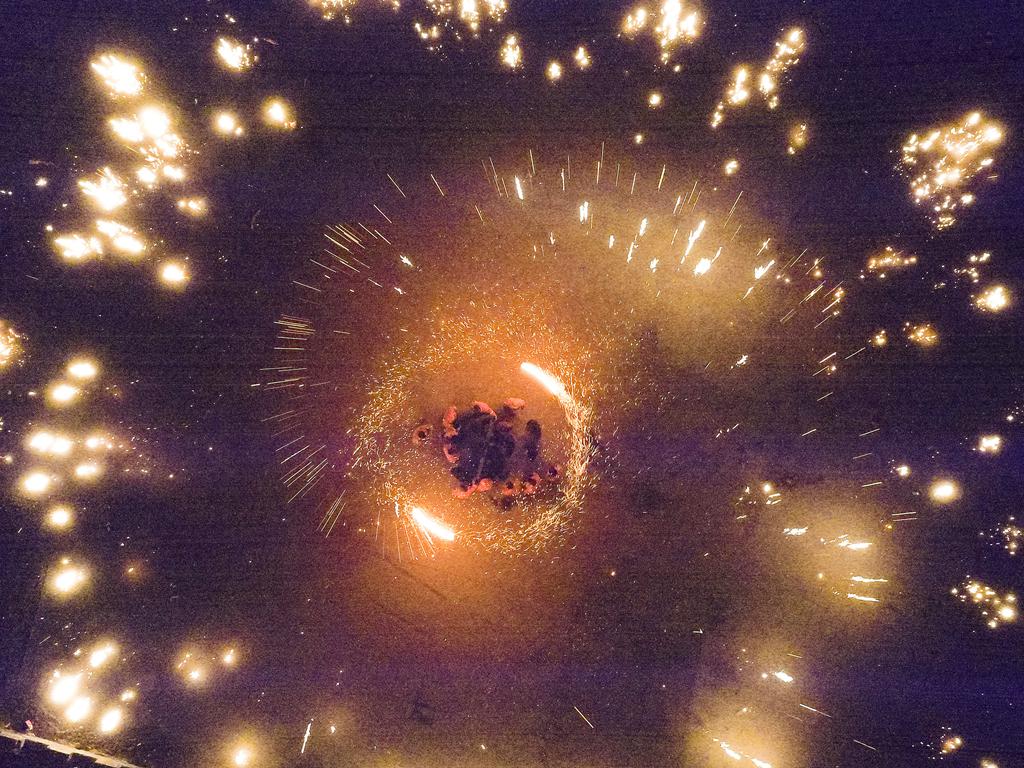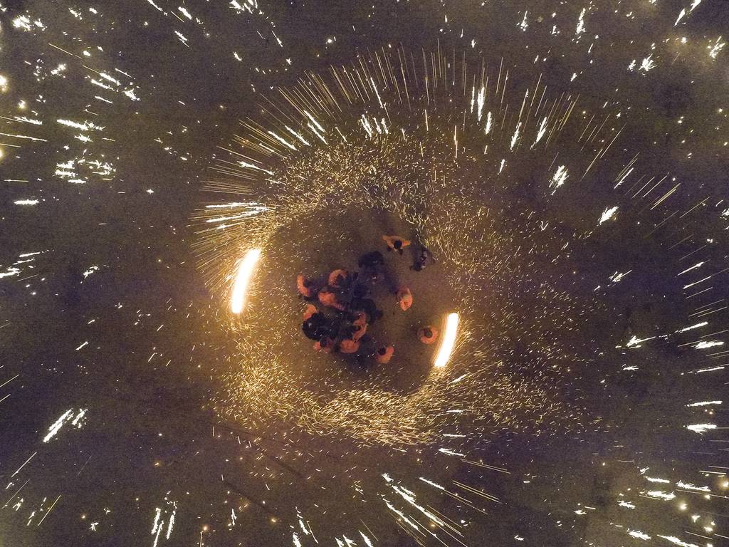 “掄花”是當(dāng)?shù)匾豁?xiàng)傳統(tǒng)的非遺民俗。表演時(shí),幾名民間藝人將木炭和碎鐵片一起放到掛在花架上的幾個(gè)花筒中燃燒,再合力掄起花架,使花筒內(nèi)升溫并向四周甩濺鐵花,形成一圈圈光線交織的光環(huán),景象壯觀。