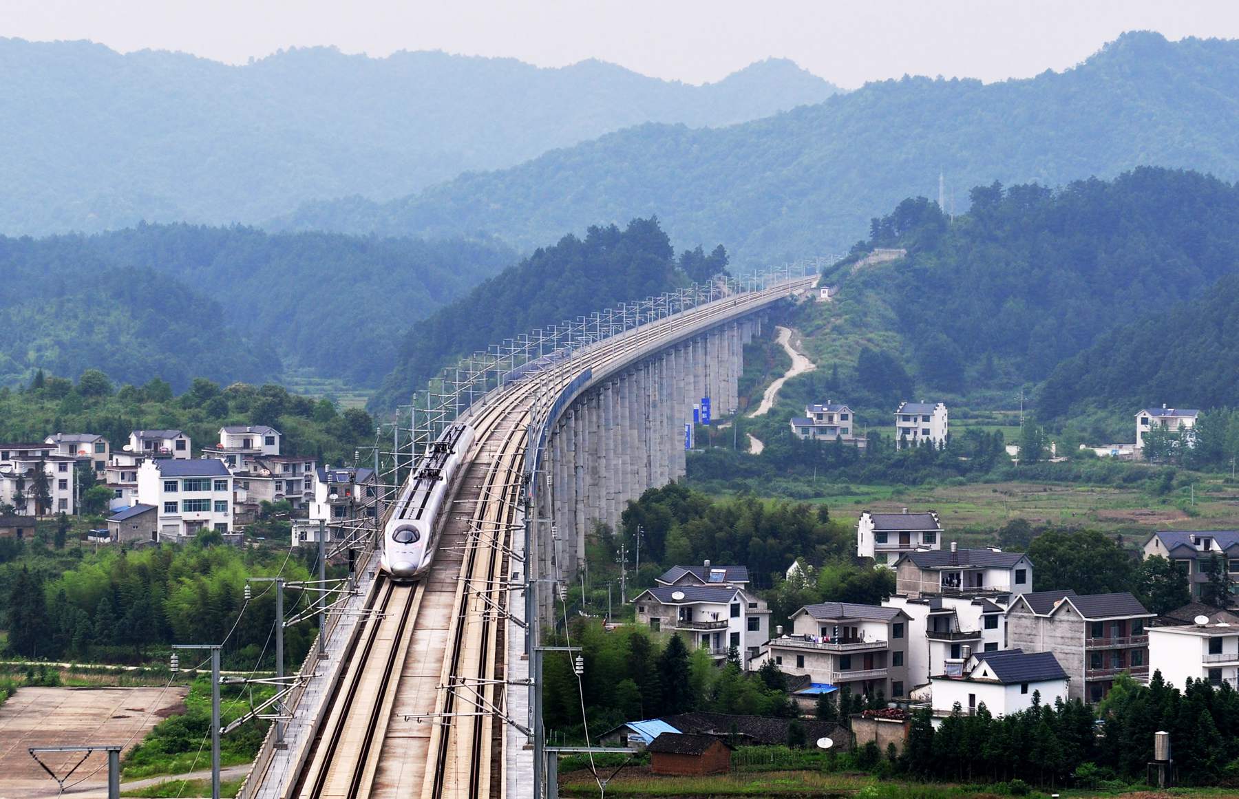 合福高鐵開(kāi)始試運(yùn)行,一列CRH380動(dòng)車組運(yùn)行在江西省婺源縣紫陽(yáng)鎮(zhèn)坑口大橋上(2015年6月1日攝)。 在過(guò)去的幾年間,我國(guó)的高鐵建設(shè)不斷加速,從高寒的東北到炎熱的海南,從發(fā)達(dá)的東部到廣袤的西北,一列列“子彈頭”穿行在華夏大地。到2014年底,隨著多條新線投產(chǎn),我國(guó)鐵路營(yíng)業(yè)里程已達(dá)11.2萬(wàn)公里,高速鐵路運(yùn)營(yíng)里程達(dá)到1.6萬(wàn)公里,位居世界第一,“四縱四橫”快速鐵路網(wǎng)主骨架已初具規(guī)模。2015年6月,滬昆高鐵新晃西至貴陽(yáng)北段、鄭焦鐵路、合福高鐵等三條鐵路相繼開(kāi)通運(yùn)營(yíng),我國(guó)高鐵運(yùn)營(yíng)里程目前已超過(guò)1.7萬(wàn)公里。快速發(fā)展的高速鐵路已成為鐵路客運(yùn)的主力軍,為推動(dòng)“一帶一路”建設(shè)和區(qū)域協(xié)調(diào)發(fā)展提供有力基礎(chǔ)支撐。