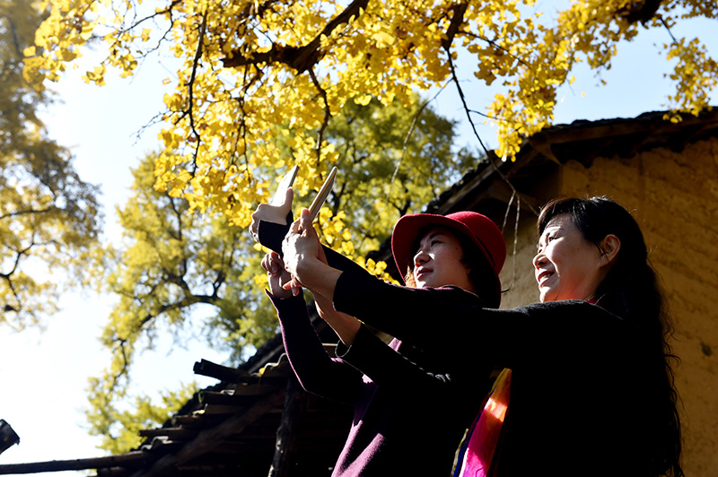11月12日,在湖北省南漳縣傅家坪村,人們在銀杏樹下自拍。