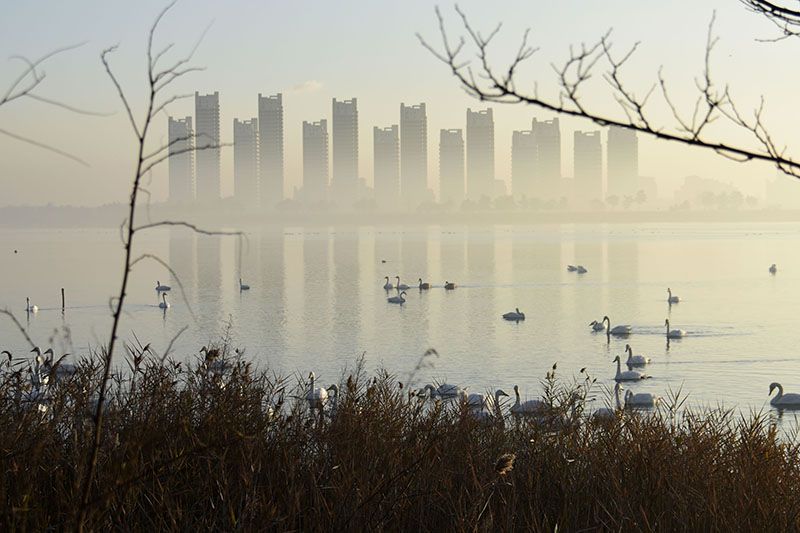 山東榮成市桑溝灣城市濕地公園位于市區東南部。公園內天然蘆葦、藻類、水草遍布其中,是南北方鳥類理想的棲息地,每年吸引上千只大天鵝前來越冬。