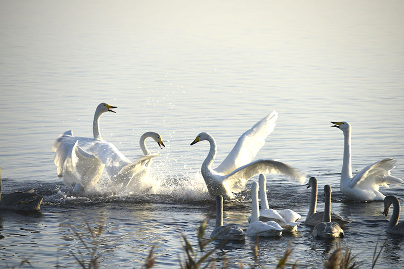 12月1日,大天鵝在山東省榮成市桑溝灣城市濕地公園嬉戲。