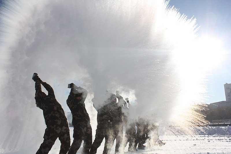 12月6日,伊春邊防支隊新兵在訓練之余玩起“潑水成冰”的游戲。