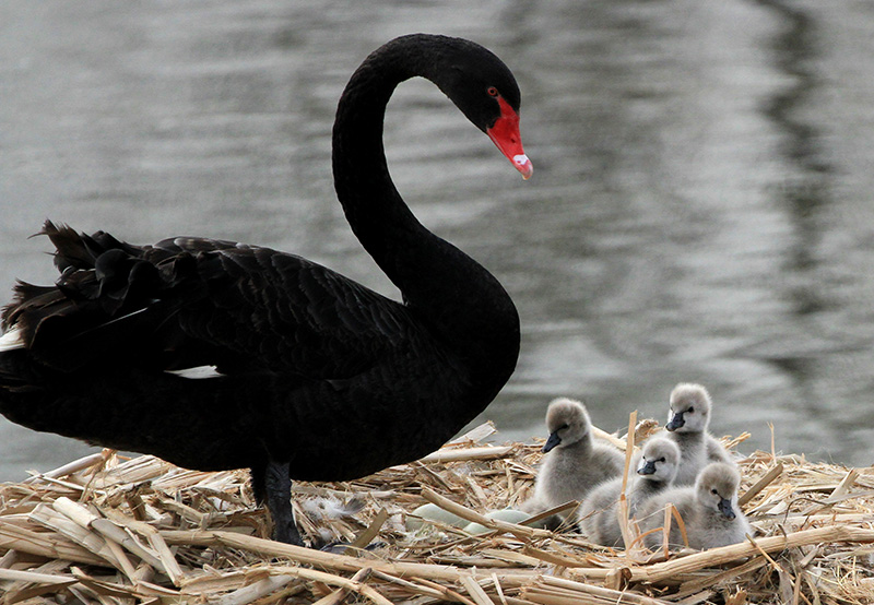 12月26日,一只黑天鵝帶著小黑天鵝在湖邊玩耍。