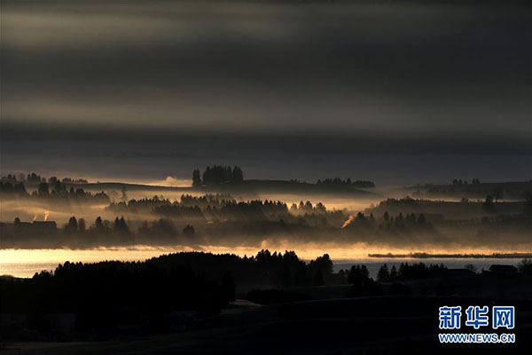 3月16日,在德國南部的柯尼希斯溫克爾,大地在曙光中被薄霧籠罩。 新華社/法新