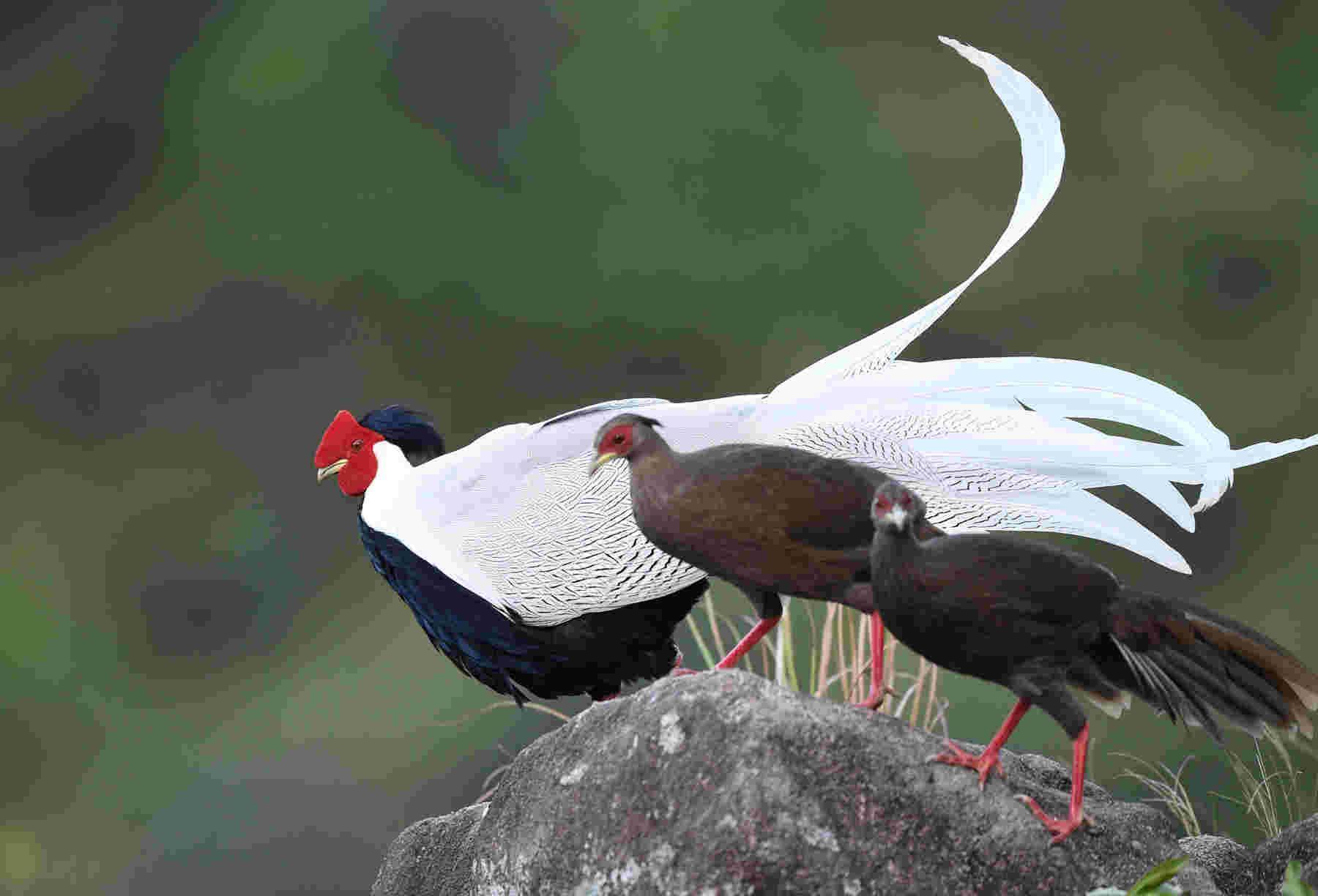 10月10日,三只白鷴站在福建省南靖縣鵝仙洞自然保護區(qū)門前一塊巖石上。