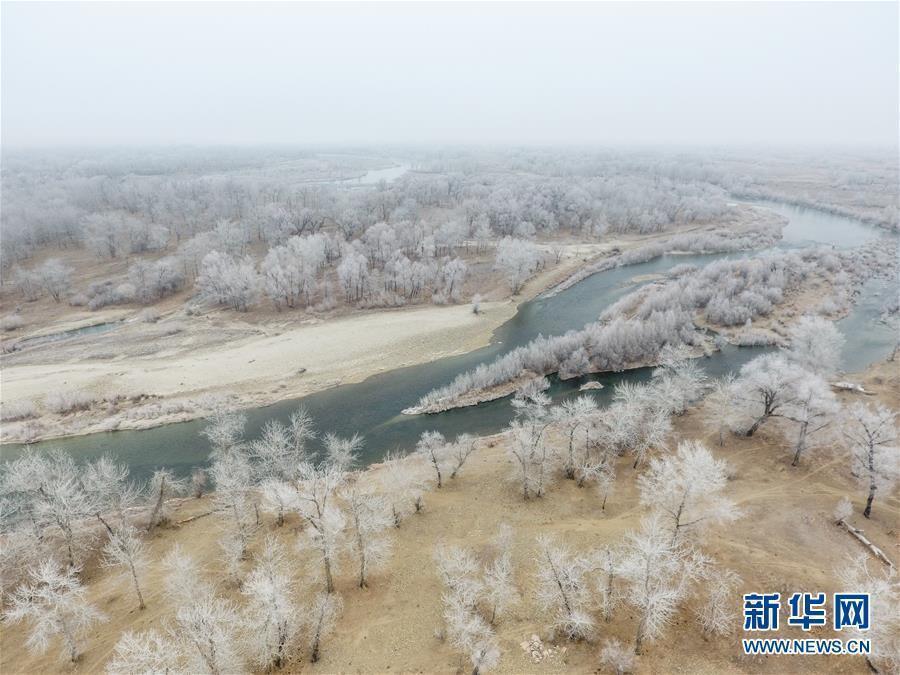 這是11月27日航拍的新疆額爾齊斯河流域的霧凇景觀。當日,新疆維吾爾自治區北屯市額爾齊斯河流域出現霧凇,從高空俯瞰,整個河谷地帶銀裝素裹,宛如仙境。新華社發(陳洋 攝)