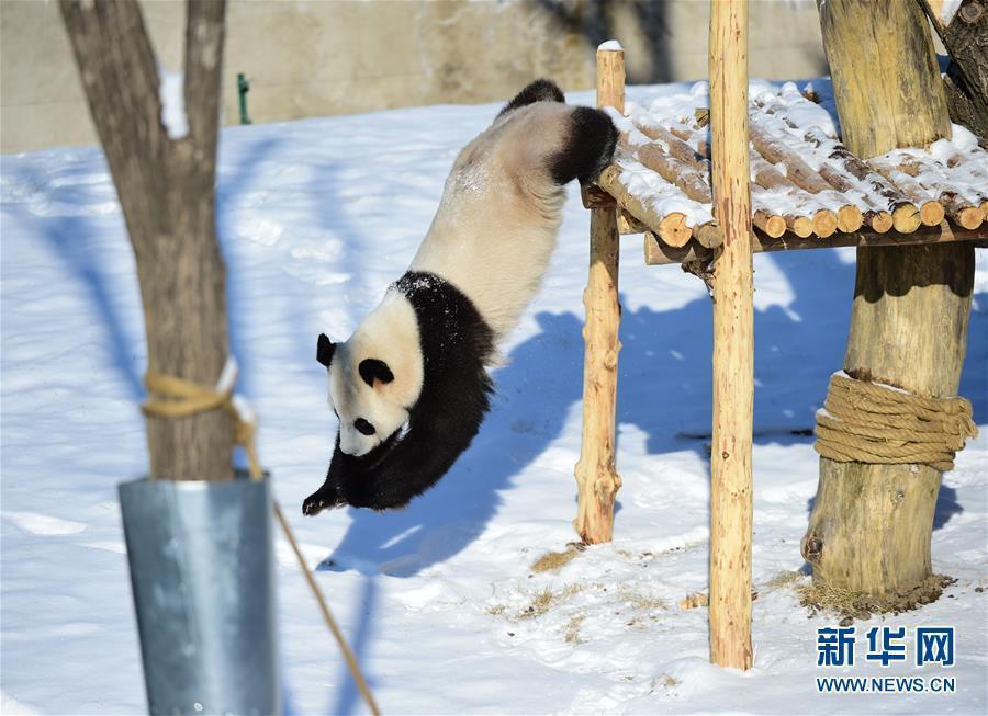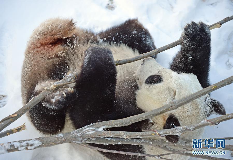 1月9日,沈陽森林動物園的大熊貓在雪中嬉戲玩耍,享受雪趣。新華社記者 楊青 攝