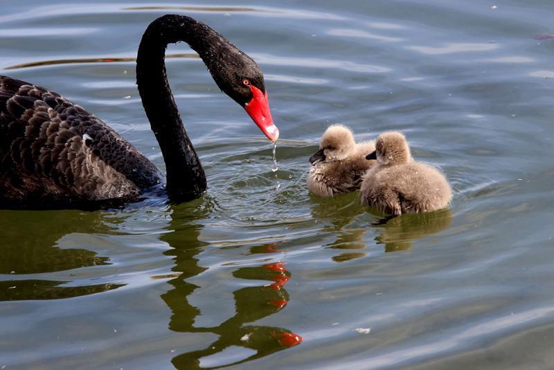 1月25日,在北京圓明園,兩只出生不久的小黑天鵝跟隨“家長”在湖中戲水。