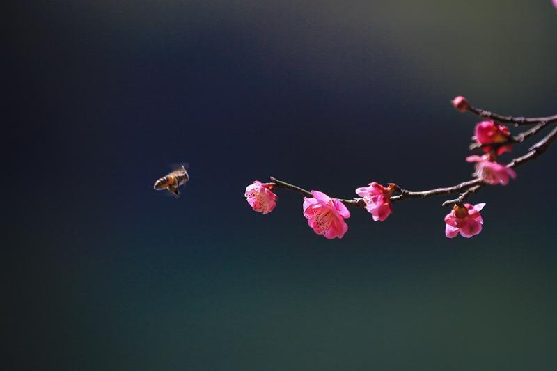 2月23日,一只蜜蜂在寧波月湖公園的梅花上飛舞。