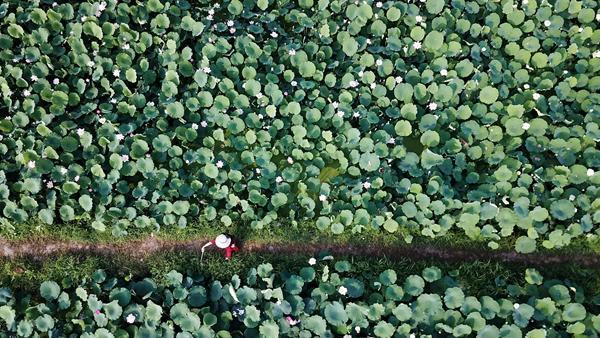 6月14日,游客在銅陵市西湖村荷花園內賞荷(無人機拍攝)。