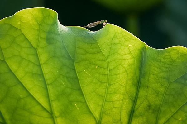 6月14日,在銅陵市西湖村荷花園內,一只豆娘在荷葉上停駐。