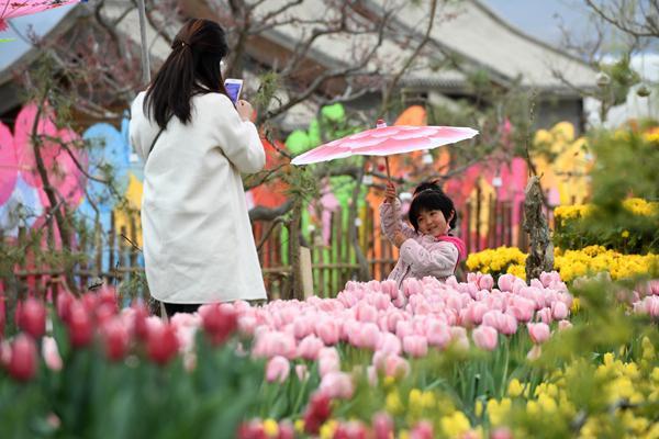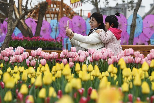 4月8日,在榆中縣李家莊田園綜合體內(nèi),游客在郁金香花叢中拍照留念。