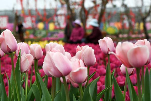 4月8日,在榆中縣李家莊田園綜合體內(nèi),游客在郁金香花叢中游覽。