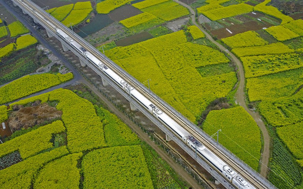 近日,貴州安順油菜花開,高鐵列車穿行其間,構成一幅幅美麗圖畫。