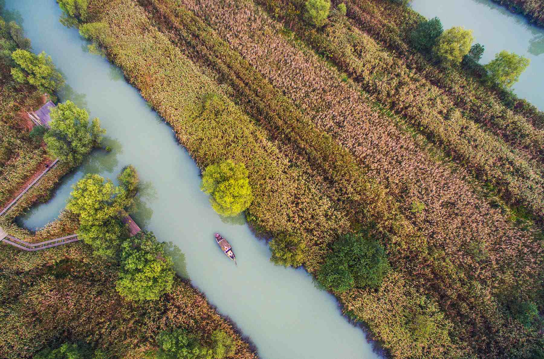 西溪濕地開(kāi)啟“五彩秋色圖” 11月3日,空中俯瞰色彩繽紛的西溪濕地景色。 進(jìn)入秋季,隨著氣溫不斷降低,杭州西溪濕地國(guó)家公園內(nèi)呈現(xiàn)出美麗的“五彩秋色圖”,常綠的樹(shù)木、白色的蘆花、黃色的草叢以及青色的水生植物等構(gòu)成了江南特有的多彩秋色。 杭州西溪國(guó)家濕地公園坐落于浙江杭州市區(qū)西部,距離杭州西湖5公里,是罕見(jiàn)的城中次生濕地、中國(guó)第一個(gè)“國(guó)家濕地公園”、國(guó)家5A級(jí)旅游景區(qū)。 西溪國(guó)家濕地公園占地面積約11.5平方公里,集生態(tài)濕地、城市濕地、文化濕地于一身,園區(qū)約70%的面積為河港、池塘、湖漾、沼澤,正所謂“一曲溪流一曲煙”,整個(gè)園區(qū)六條河流縱橫交匯,水道如巷、河汊如網(wǎng)、魚(yú)塘櫛比如鱗、諸島棋布,形成了西溪獨(dú)特的濕地景致。秋季園區(qū)內(nèi)蘆花盛開(kāi),游客可以在這里“賞秋聽(tīng)蘆”,看到“十里蒹葭十里洲”的秋季美景。
