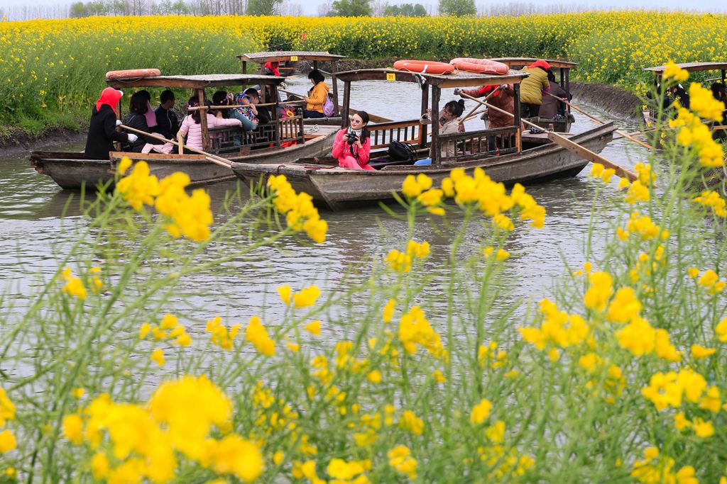 4月9日,游客在江蘇興化千垛菜花風(fēng)景區(qū)游覽。