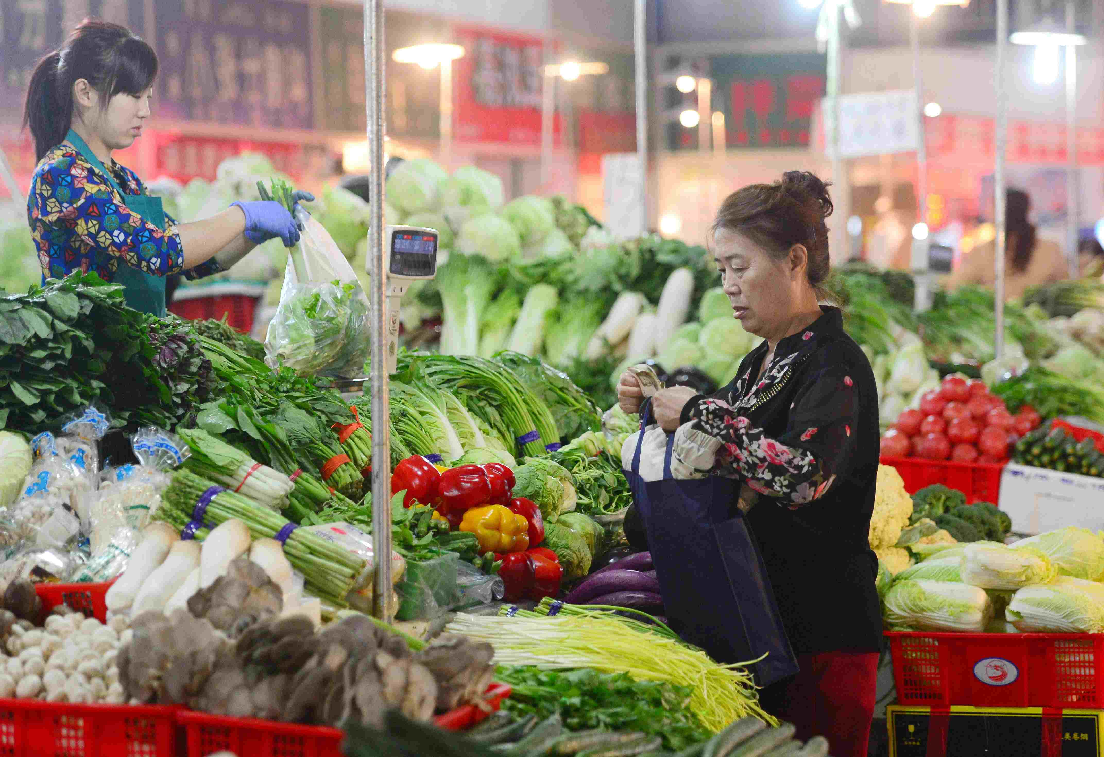 市民在河北石家莊市塔北路農(nóng)貿(mào)市場購買蔬菜(10月13日攝)。