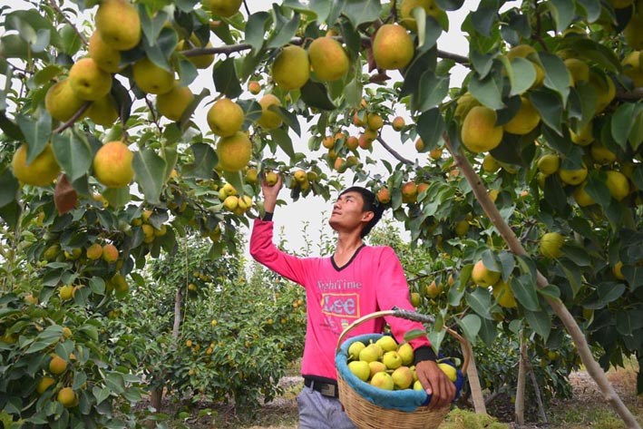 新疆庫爾勒市二十九團果農在采摘香梨。