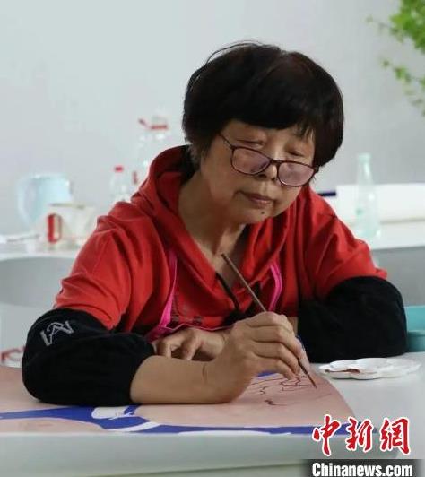 在袁花鎮新時代文明實踐所4樓的農民畫藝術中心,農民畫非遺傳承人趙耀芬戴著老花鏡、穿著圍兜,正在專注地創作最新的畫作。