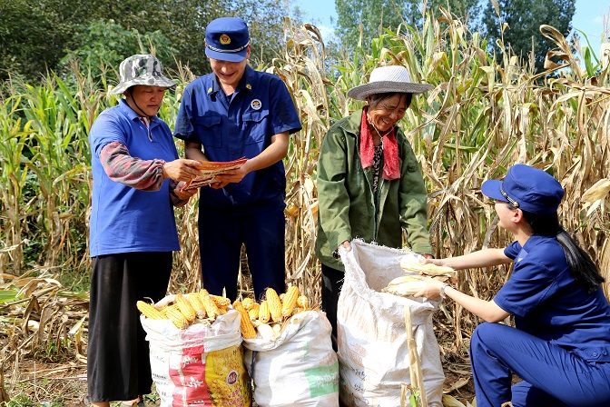 圖為2024年9月20日,在山東省棗莊市山亭區山城街道石龍口村,助農服務小分隊在田間幫助村民一起收玉米,普及秋收防火知識。(來源:中國農村網 攝影:季龍)