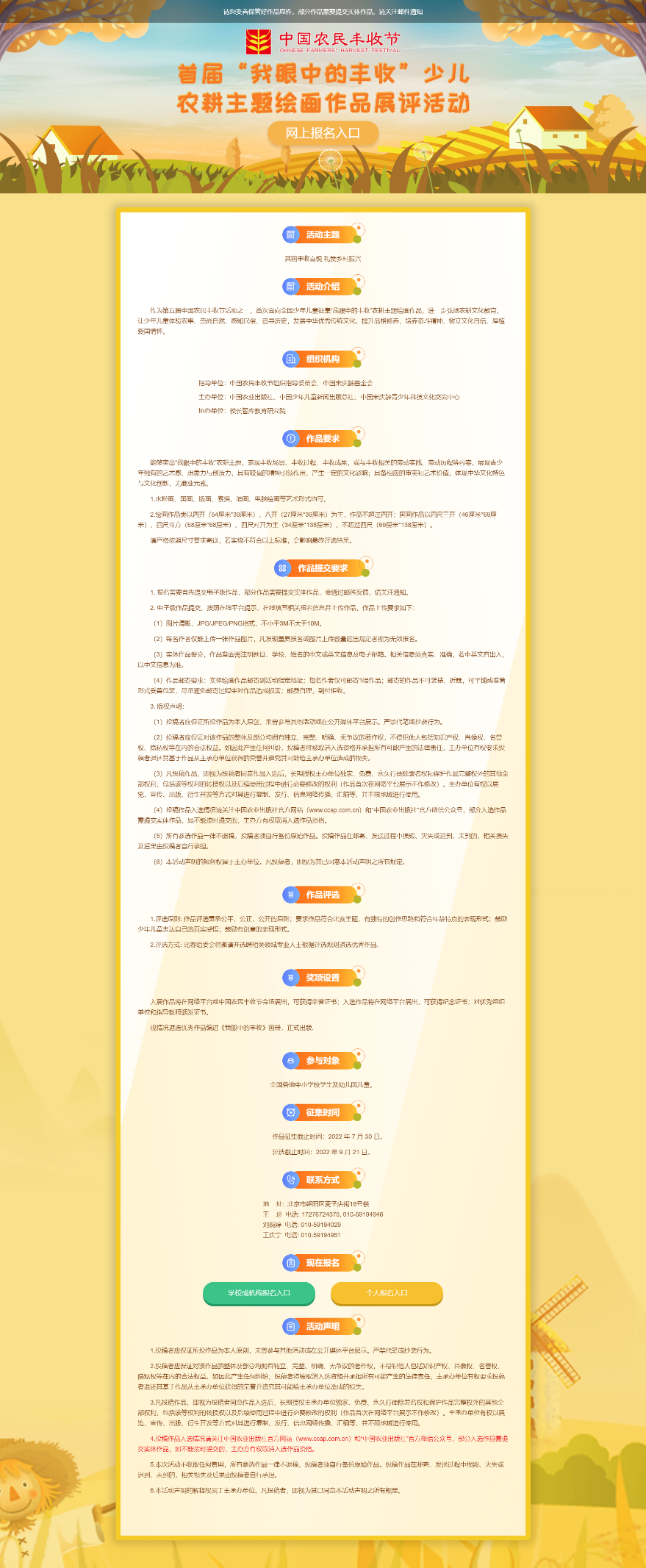 活動屬于公益性質(zhì),秉持自愿原則,不收取報名、參展、出版等費用。參賽主題要展現(xiàn)中華農(nóng)耕文化,表現(xiàn)豐收喜慶、豐收過程、豐收成果,或與豐收相關的勞動實踐、勞動歷程等內(nèi)容。參評作品通過網(wǎng)絡向全社會征集,鼓勵少年兒童表達自己的真實感悟且運用有創(chuàng)意的表現(xiàn)形式,包括但不限于水粉畫、國畫、版畫、素描、油畫、電腦繪畫等多種藝術形式,作品征集截止時間為2022年7月30日。