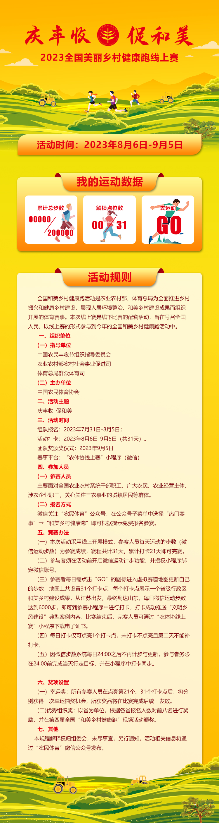 本次賽事由中國農(nóng)民豐收節(jié)組織指導(dǎo)委員會、農(nóng)業(yè)農(nóng)村部農(nóng)村社會事業(yè)促進(jìn)司、體育總局群眾體育司指導(dǎo),中國農(nóng)民體育協(xié)會主辦。除線上比賽外,本屆和美鄉(xiāng)村健康跑現(xiàn)場活動將于9月4—6日在山東省濟(jì)寧市泗水縣龍灣湖鄉(xiāng)村振興示范區(qū)舉辦。